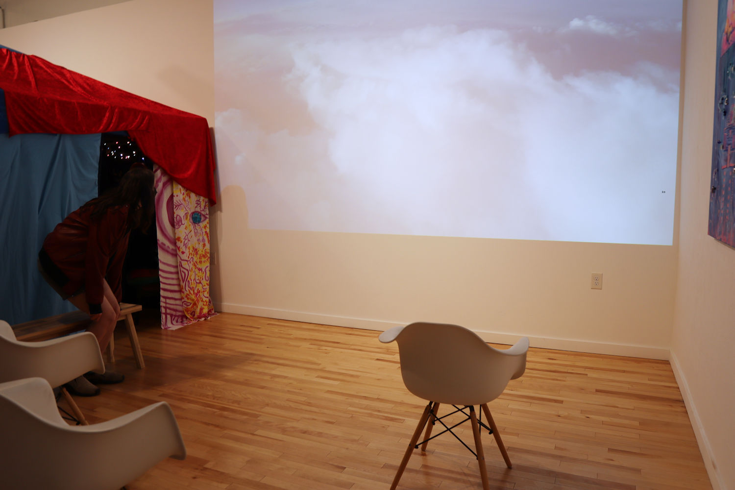 I hope that as people enter they see the red viewfinder and are able to look inside and revisit the nostalgic experience of using that toy as a kid. As visitors drift down the line of art along the main walls and podiums, I hope they find themselves in the dream lounge. This is the most immersive part of the exhibit, where everything from the seating to the lighting is handmade art. I was so happy to see people gathering and pausing in this space to talk, visit and relax. The longer someone rests there, the more tiny details they can notice. Finally I hope guests float from the lounge into a space in the back of the gallery. There they can sit and listen to the traffic sounds and nature moments from around the world as they watch the clouds go by.