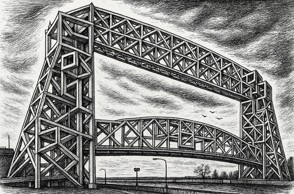 Not too long ago I looked at the Aerial Lift Bridge, and for a moment my mind mis-read it as having the wrong angles of an Escher-like “impossible cube,” pictured here. The optical illusion has stuck with me and now I have to force myself not to see it. It is beyond me at the moment to produce my mental image as a drawing or doctored photo, but I wanted to get the idea out there in case the vision inspires anybody. Post images as comments if you’re feeling it, otherwise I am content to just keep privately seeing an impossible lift bridge.