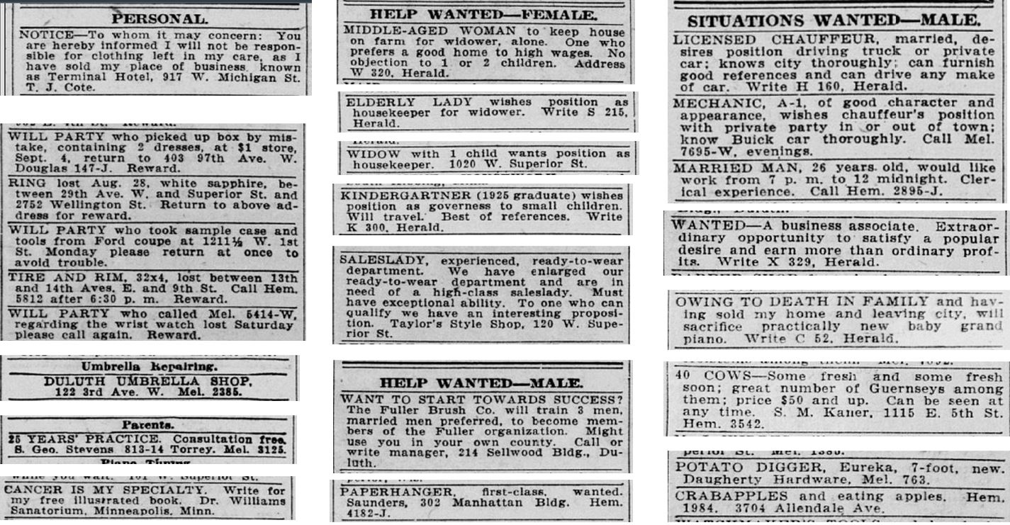 Before Craigslist and Facebook Marketplace, the classifieds were the place not only to buy and sell personal items, but also to get out a variety of messages to the community. The image below collects some of the more interesting listings from Sept. 7, 1925.