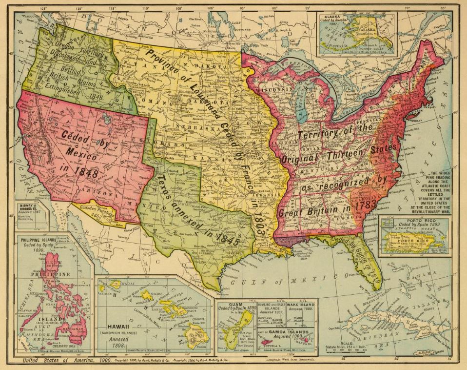 A map of the United States from 1900, showing the Philippines in the lower left corner as a U.S. territory.