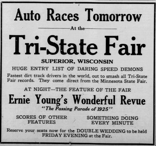 The Tri-State Fair started in Superior, with the opening dedicated to Labor Day and organized by Superior’s trade unions. The fair included automobile races, poultry and needlework displays, an “aisle of fun,” and a double wedding to represent the Twin Ports, with one couple from Superior and another from Duluth. The organizers expected 100,000 visitors across the five days of the fair.