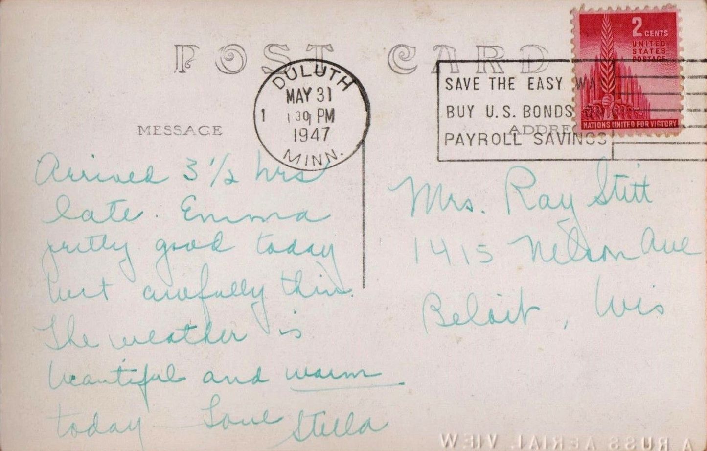 The 1940s-era image is from a postcard mailed on May 31, 1947. The photo is credited as “A Russ Aerial View.” The card was sent to Mrs. Ray Stitt of Beloit, Wis. The message on the back reads:
