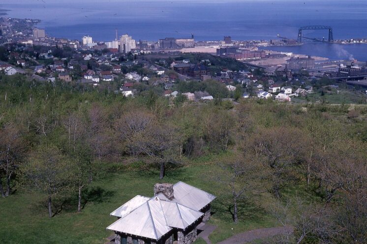 This uncredited photo shows a view of Duluth from Enger Tower looking out over Observation Hill to the downtown and waterfront. It is dated 1965.