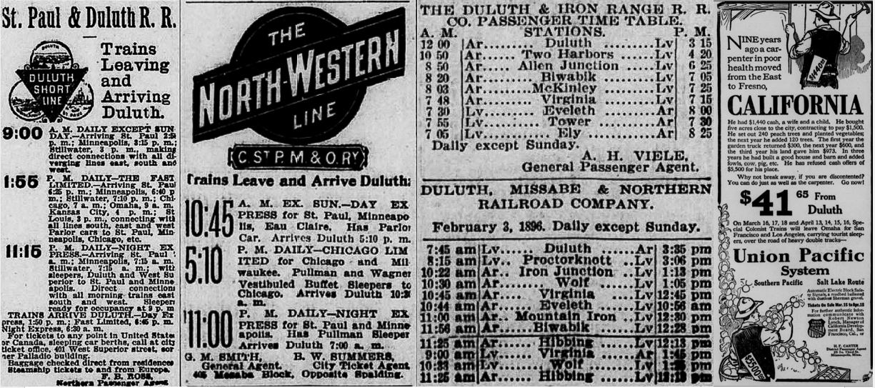 Left: Duluth Evening Herald, May 27, 1896; Right (California train ad): Duluth Herald, March 15, 1913.