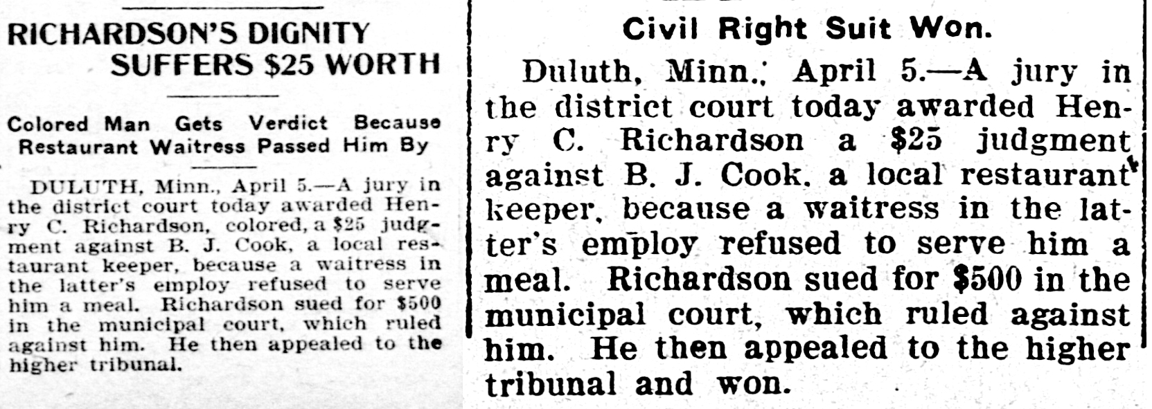 On April 5, 1905, a Duluth jury under the instructions of Judge Cutting deliberated for three hours and ultimately found Cook liable for the refusal to serve Richardson.17 While he sought $500 in damages, the maximum allowed under the law, Judge Cutting ended Richardson’s four month legal battle by awarding him $25, the minimum fine Cook would had received from a misdemeanor conviction.18