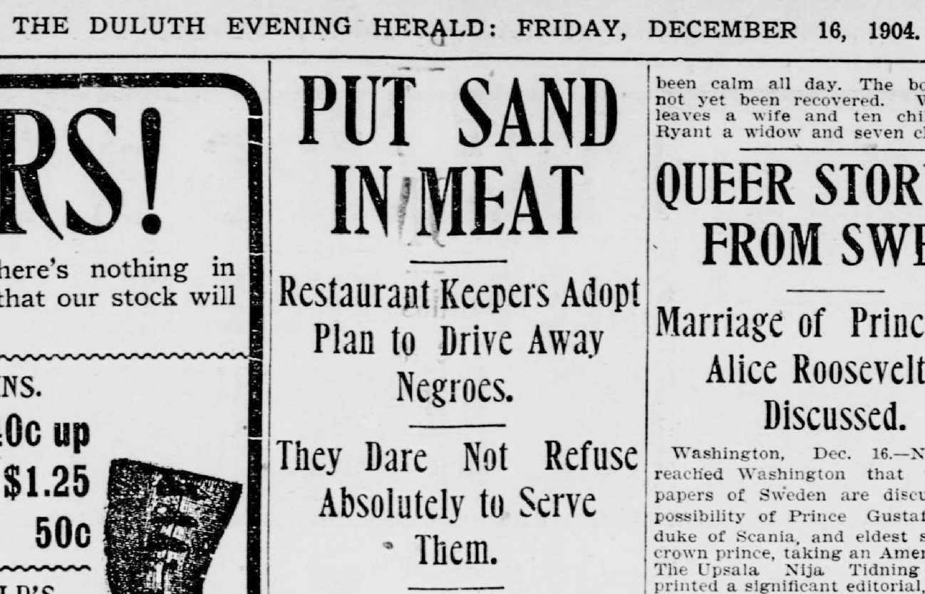 Yesterday at the noon hour, two negroes recently arrived in the city from Minneapolis, entered one of the Superior Street restaurants and, ordered roast beef. The waitress took the order and after waiting for from fifteen to twenty minutes brought the negros their dinner. When they attempted to eat it, however, they discovered that the plate had been sprinkled with sand before the meat was placed upon it, and they were unable to eat a mouthful.