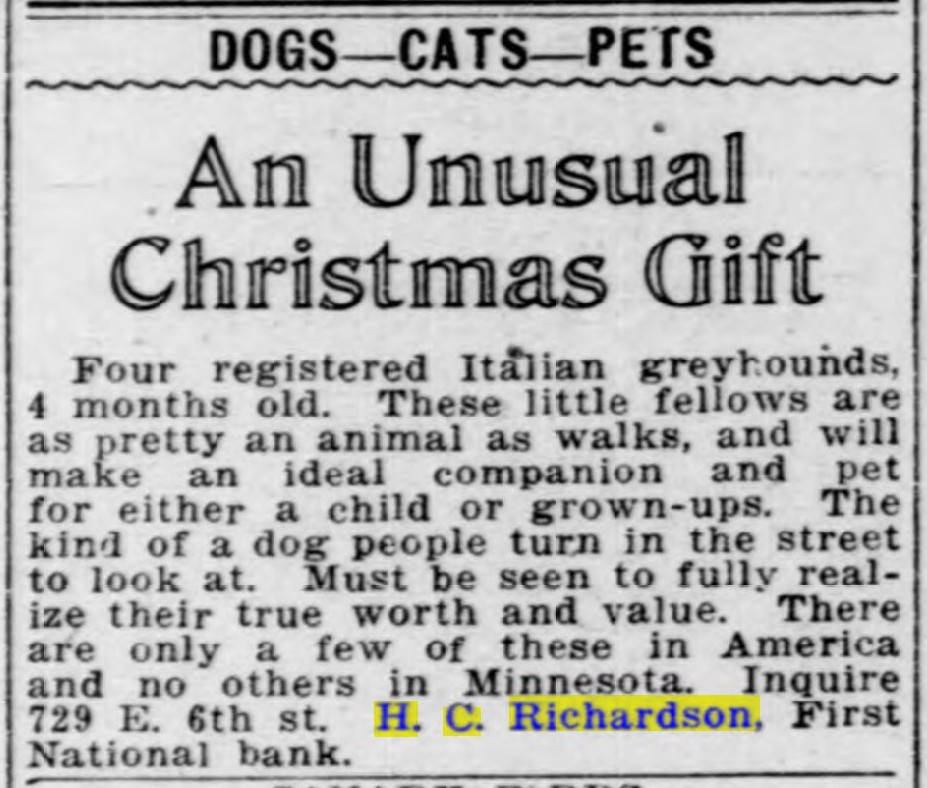Henry also bred dogs, specifically Italian greyhounds. The Duluth Herald from Oct. 30, 1923 reports that he took part in the first dog show of the Head of the Lakes Kennel Club. Two years later, on May 22, 1925, the Herald reported that he had won best of breed for his dog Regina (he was the only one who entered an Italian greyhound).